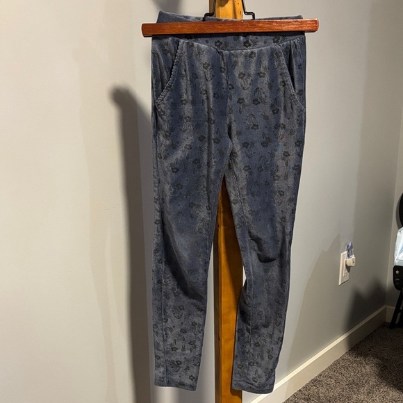 Stylish blue pants with a subtle flower pattern. Perfect for casual wear. Some wear on knees.