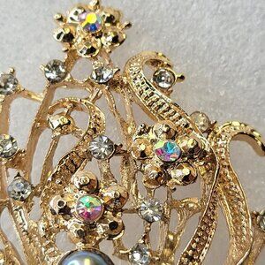 Blue Pearls Floral Brooch in gold tone with aurora borealis rhinestones