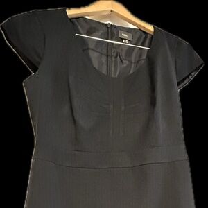 Sophisticated and stylish blue pinstripe dress, perfect for the office or any professional setting. This fitted dress is a size 10 and falls right at the knee on a 5'7" frame—flattering and polished.