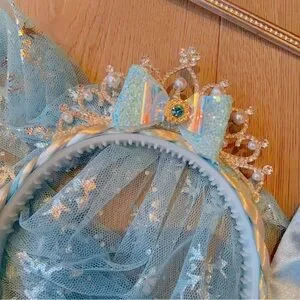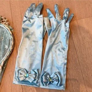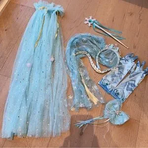 Enchanting blue princess hair accessory set perfect for dress-up and play. Includes a sparkling cape, wand, hair clip, braid wig and gloves for a magical look.