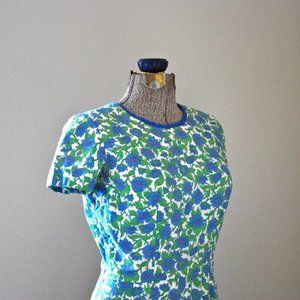 This blue & purple floral dress has a classic round neckline, with a straight pencil shape. It is lined with white fabric and fastens with a metal zipper down the back. This dress can be accessorized with a belt to define the waistline or paired with a cardigan or blazer on chilly spring days or summer nights.