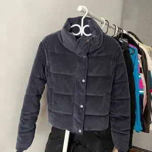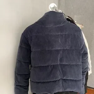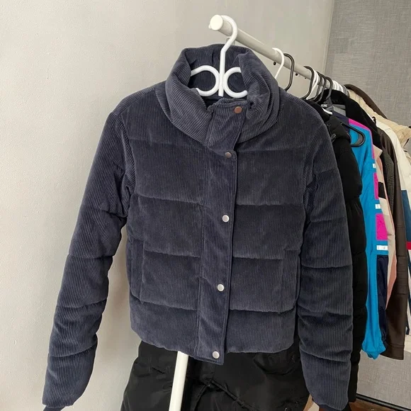 This blue corduroy puffer jacket features a quilted design with horizontal stitching, offering both warmth and style. The high collar provides extra protection against cold weather, Ideal for staying cozy during chilly days.