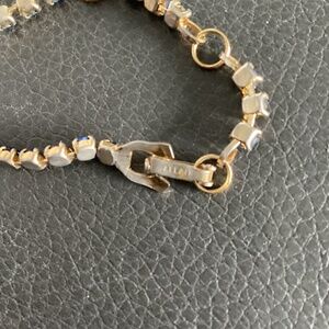 Vintage, adjustable blue and pale yellow rhinestone necklace, set in gold-tone metal. Very attractive piece. There is a maker’s mark but I’m unable to read it. It measures 17 inches. Update: the maker’s mark is ALLAIN.