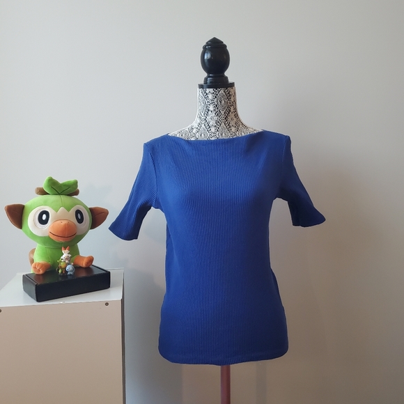 Blue Ribbed Boat Neck Top