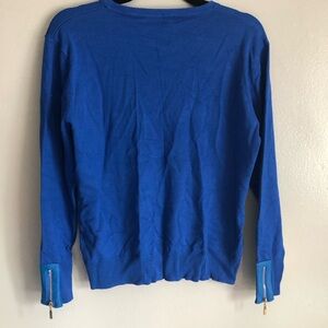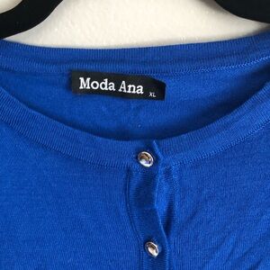 This elegant cardigan showcases a rich blue hue and a ribbed texture, perfect for adding a touch of sophistication to your outfit. Its long sleeves and classic design make it an ideal layering piece for cooler days. The cardigan's timeless style ensures it complements a variety of looks.