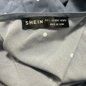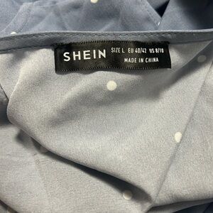 Elegant blue mini dress with ruffle details. Features a tie waist and subtle polka dots. Perfect for casual outings.