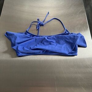 Stylish blue bikini top with ruffled design. Perfect for beach days. Fitted top under neath the ruffles.