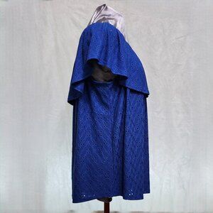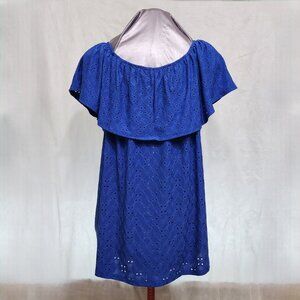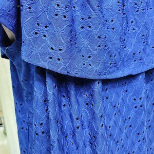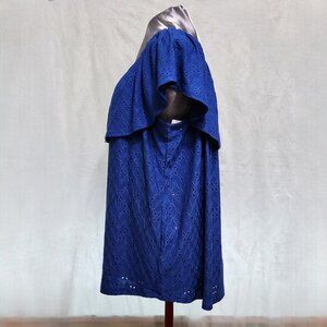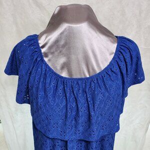 French Twist Blue Ruffled, Lace style Blouse. Polyester & Spandex. Made in Bangladesh. Size 1 X. Sleeveless, but ruffle where sleeve would be, covering shoulder. 28 inches Pit to Pit aprox. 28 inches shoulder to hem aprox. without stretch. NWOT. EUC. Excellent Unused condition.