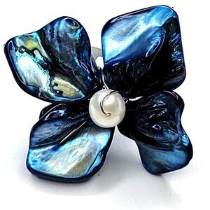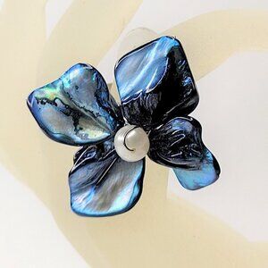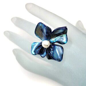 Blue Sea Shell with Freshwater Pearl Bead Asymmetric Flower Adjustable Ring