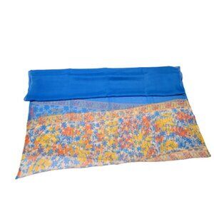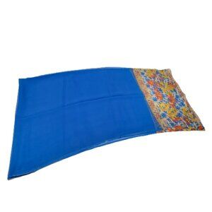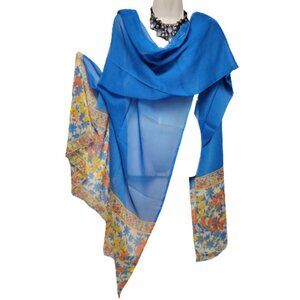 Large Blue Scarf Sheer and Long with floral motif at the border ends of blue orange and yellow flowers Approx. 88" x 43" SCF 8 - 111SIL