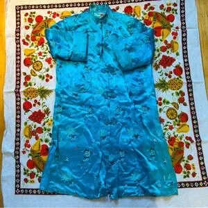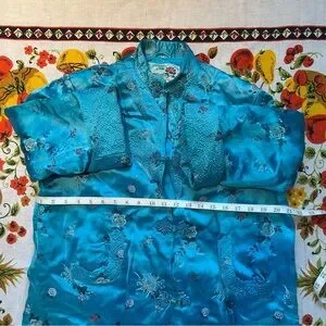Stunning blue silk robe, made in china. Material feels quilted, very cozy & soft. See photo for measurements