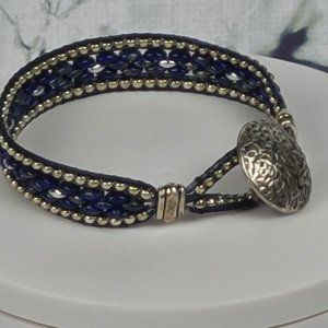 Blue and silver Bead and Leather Bracelet with Silver Button