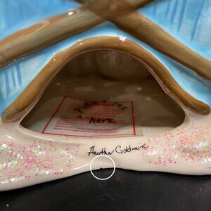The Blue Sky Clayworks Polar Penguin Post Office Tealight House is a limited edition holiday collectible made of ceramic by artist Heather Goldminc. This tealight house features Santa's post office details at the North Pole with a penguin postman.