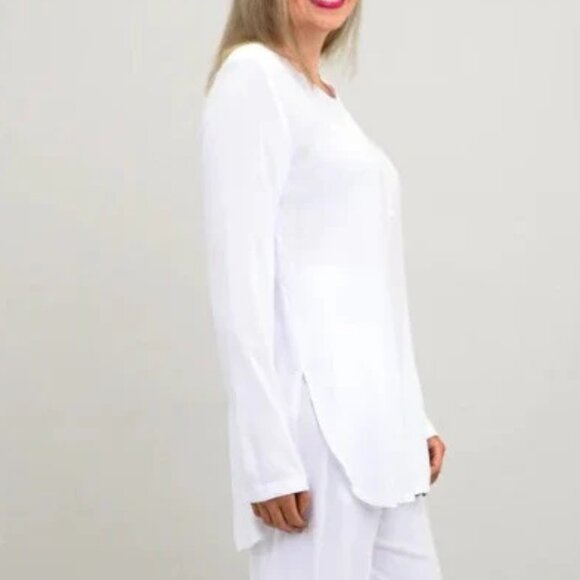 Blue Sky's Tara blouse offers timelessly tailored style in cool-wear Bamboo Linen. Traditional shirt in shoulders and placket, the Tara has a suggestion of tunic ease in length and mid-section ease. A small straight collar offers coverage, with a small V-neckline. Crisp, and easy to wear over capri pants or leggings. Never Worn.