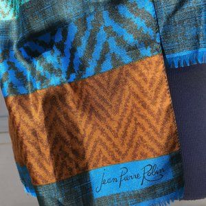 Scarf by Jean Pierre Robin in blue & tan colorway print pattern. 12" wide x 54" long. Lightweight 100% polyester is perfect for use as a neck scarf, hair tie, etc..