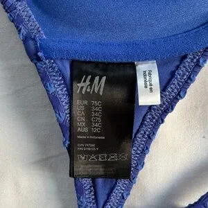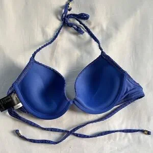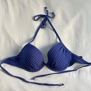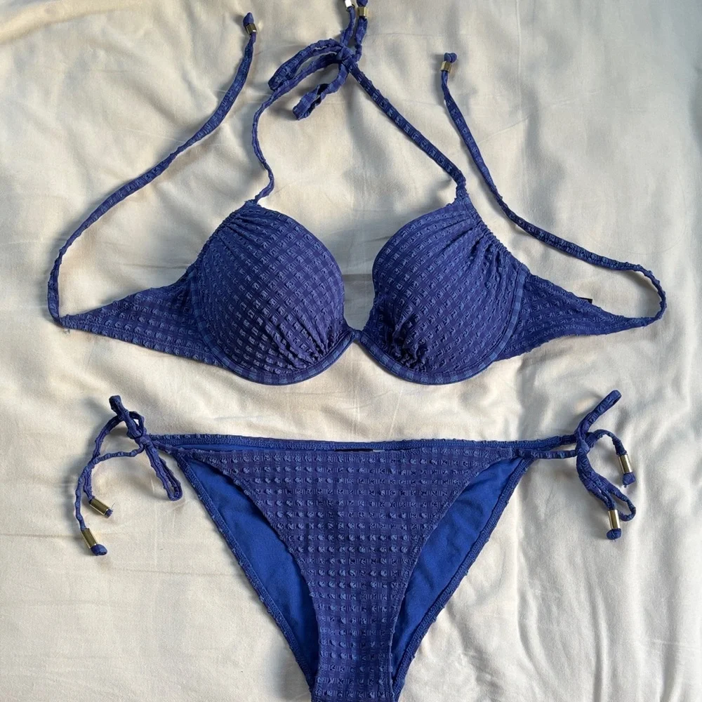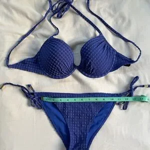 Adjustable string bikini, size 8 bottoms, size 34C top. Push-up bra style.