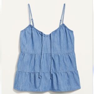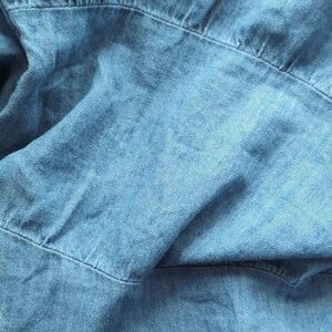 Adjustable shoulder straps. Elasticized split neck, with tie-front fastening. Darted bust. Tiered swing silhouette. Soft, enzyme-washed, slasher-dyed blue color.