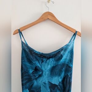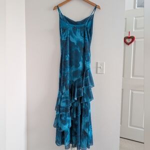 Step out in style with this elegant blue floral dress. Perfect for any occasion, this dress features a stunning design that will turn heads. In perfect condition no rips are stains has a very good degree of stretch to it as well