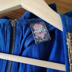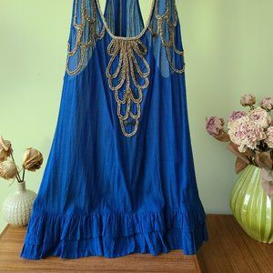 Beautiful jewel-tone blue racer back tank/tunic that yes, I used to wear as a mini dress, from Free People. The tank features gold embroidery on the front, layers at the very bottom, and a zipper than runs the entire back of the top/dress. I've worn it a bit (mainly when going out, which was not too often), so in good condition.