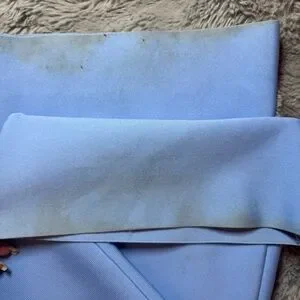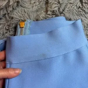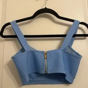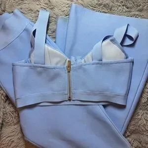 Blue/periwinkle two piece set with bra top bustier and flare bottom pants. I wore this super cute set one time for my birthday last year and haven't touched it since. There's slight makeup stains on the top that can be cleaned easily and some marks on the bottom hem from it dragging since it's a touch too long for me. Gold zipper on both top and pants. I bought this for 150 but due to wear I'm giving it away for 95