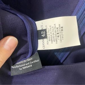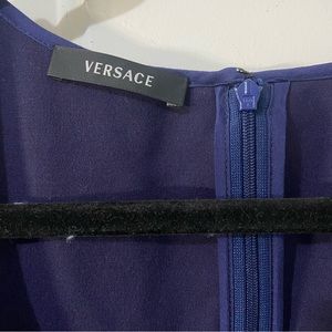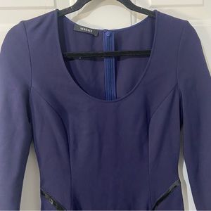 Navy blue Versace dress in excellent condition. Made in Italy. Features black pleather details and zipper down the back. Fabric has some stretch.