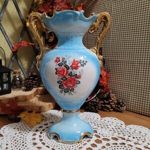 Blue Vintage Italian Porcelain Urn Vase with Pink Roses