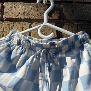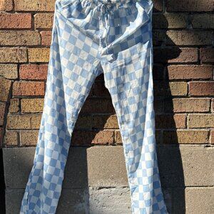 Trendy blue and white checkerboard sheer pants with a relaxed straight-leg fit. Features an elastic waistband with drawstring for comfort. Lightweight fabric makes these perfect for casual wear or lounging.