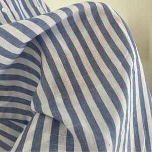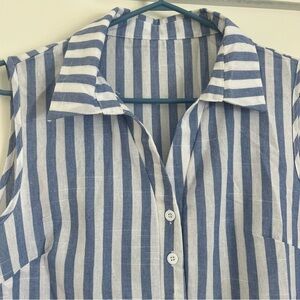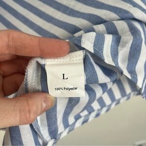 Lightweight sleeveless striped dress in blue and white, size Large. Features a collared neckline, partial button-front closure, and an airy semi-sheer fabric that makes it perfect as a beach cover-up or casual summer dress. Made from 100% polyester with a linen-like look and flowy drape. Easy to throw on over swimsuits, or style with sandals for a breezy warm-weather outfit. Measurements included in photos for best fit.