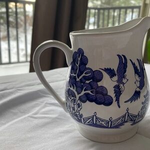 KEYWORDS: blue willow japanese ceramic pitcher blue willow china blue and white china white enamel pitcher made in england floral pitcher blue chinoiserie blue white porcelain white ceramic creamer pitcher