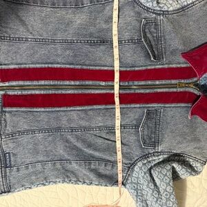 Stylish Y2K blue cardigan with red accents. Features a unique pattern on sleeves. Perfect for layering.