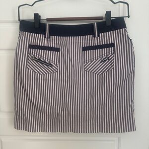 This A-line mini skirt features a striking vertical striped pattern in blue and black, perfect for casual outings or a day at work. Its structured design offers a flattering fit, making it a versatile addition to your wardrobe.