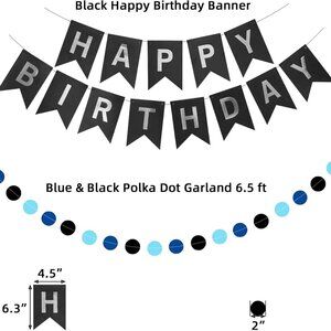Birthday Decorations for Him: 42PCS birthday decorations include 1 black HAPPY BIRTHDAY banner, 2 blue fringe curtains, 1 blue black circle hanging garland, 6pcs 6in Honeycomb Balls, 30pcs 12in latex balloon, 1pcs dot stickers, 1pcs ribbon