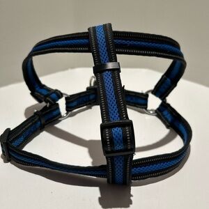 Stylish pet harness in blue and black. Adjustable straps for a comfortable fit.