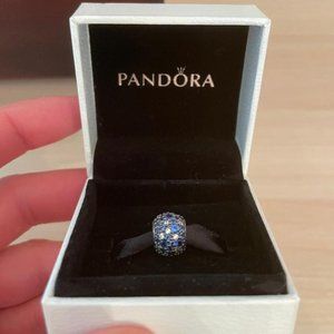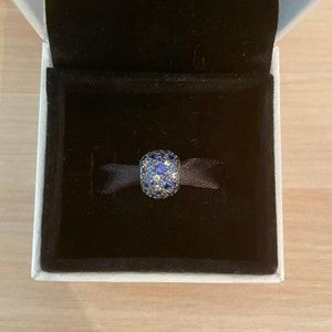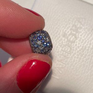 Round Pandora charm of blue and crystal gems set on silver. Can be fitted onto necklaces or bracelets.