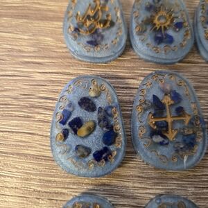Set of blue stones with gold symbols. Lapis Lazuli inclusions.