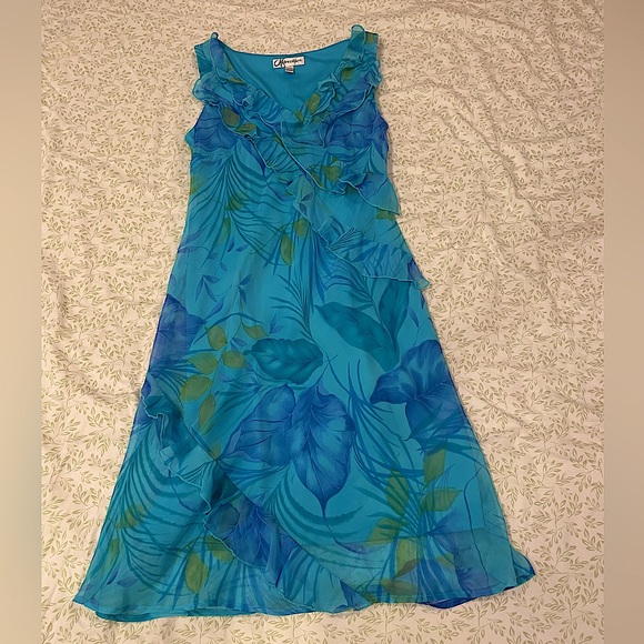 Elegant dress with a vibrant blue and green floral pattern. Features stylish ruffles for a chic look.