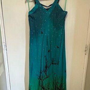 Step out in style with this elegant blue and green maxi dress, featuring a dreamy forest-inspired pattern in black with delicate trees and birds. Designed with a flattering fit and flowing silhouette, this dress beautifully combines comfort and sophistication for an effortlessly striking look.