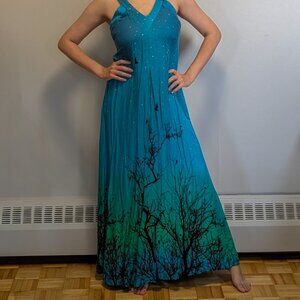 Blue and Green Forest-Print Maxi Dress