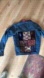 This jean jacket combines classic blue denim with vibrant red decorative trim for a stylish look. The medium wash blue color and patterned accents make it a standout piece in any wardrobe.