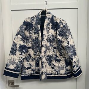 Stylish jacket with intricate blue and white patterns. Perfect for a unique look.