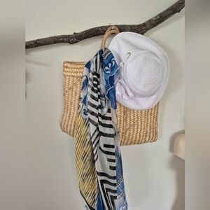 Elegant blue and white scarf with intricate patterns. Perfect for adding a touch of style.