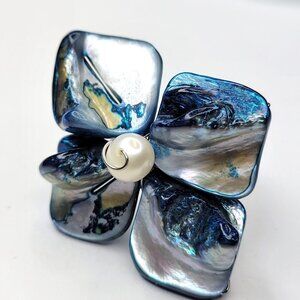 Blue and White Sea Shell Freshwater Pearl Bead Asymmetric Flower Adjustable Ring
