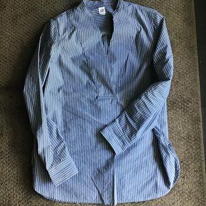 Boxy, cotton, blue and white striped tunic blouse from the GAP. Long sleeved, placket front, sits below hip.
