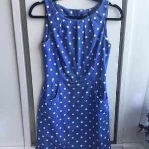 Blue and white sleeveless polka dot dress with pockets. Great for summer days in the office.