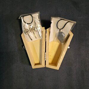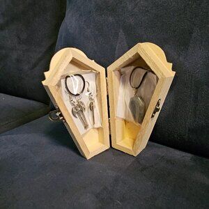 New, blue aventurine coffin gemstone/crystal pendant, stone length 1.25 inches + bail ~1.6 inches, black cotton PVC coated cord ~24 inches, wear together with and below the double sided, battle axe, 1.5 inches, pendant and earrings set, made of silver coloured zinc alloy, with black cotton PVC coated cord ~18 inches, stainless steel fish hook earrings, 2.125 inches long. Keep in a wooden coffin jewellery box, plywood. Boho, goth, whimsygoth, metal, RPG, D&D, Viking, medieval, witch, spooky Halloween vibes.