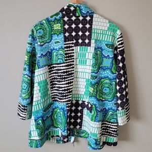 Zip up sporty style with a fun maximalist blue patchwork style pattern and studded detail near the pockets