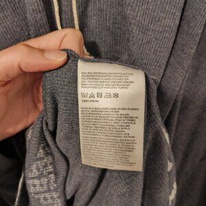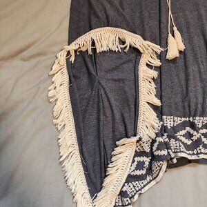 Very good used condition blue poncho/tunic top in size medium. Loose and flowy, this would fit larger and smaller sizes depending on how oversize you want it to be. Cute white fringe along the sleeves and side with white decorative pattern along the bottom hem. White tassle at neckline. Garment does have sleeves!