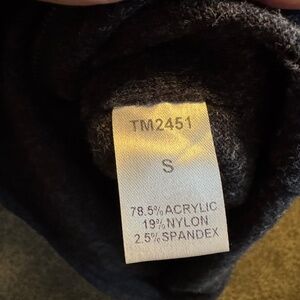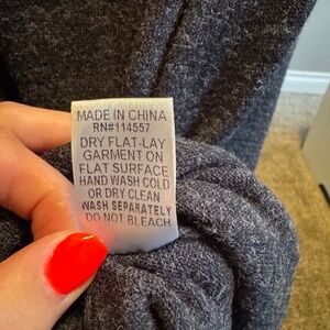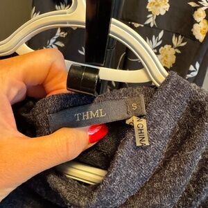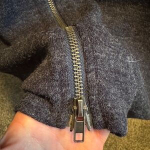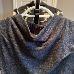 Navy blue body con dress with contrasting zipper detail. Zipper is functional and starts on front bottom and ends on back neck. Cap sleeves. Dress goes to mid-shins. Material is wool-like and cozy.