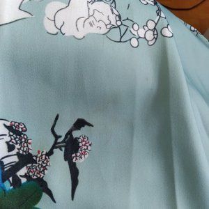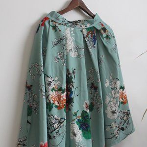 This is a beautiful A-Line skirt that falls just below the knee. It's polyester, with a satin-y feel and a pretty heavy fabric so it sits really nicely. And yes, it has pockets! There is one discoloured patch that isn't really noticeable with the pattern (see pictures) but maybe if you're good with stains you can sort that out too!