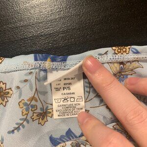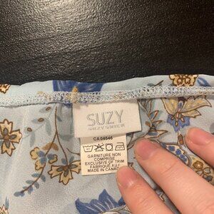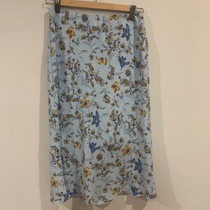 Blue floral midi skirt from Suzy Shier. Slight ruffle/lettuce trim detail in the hem. Eleastic waist. Excellent condition.